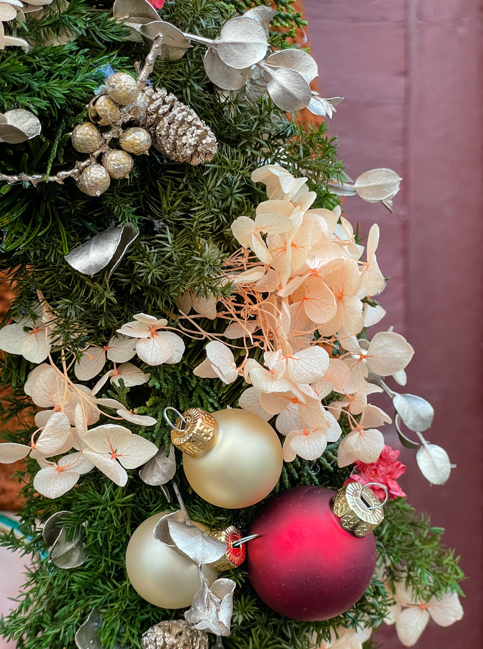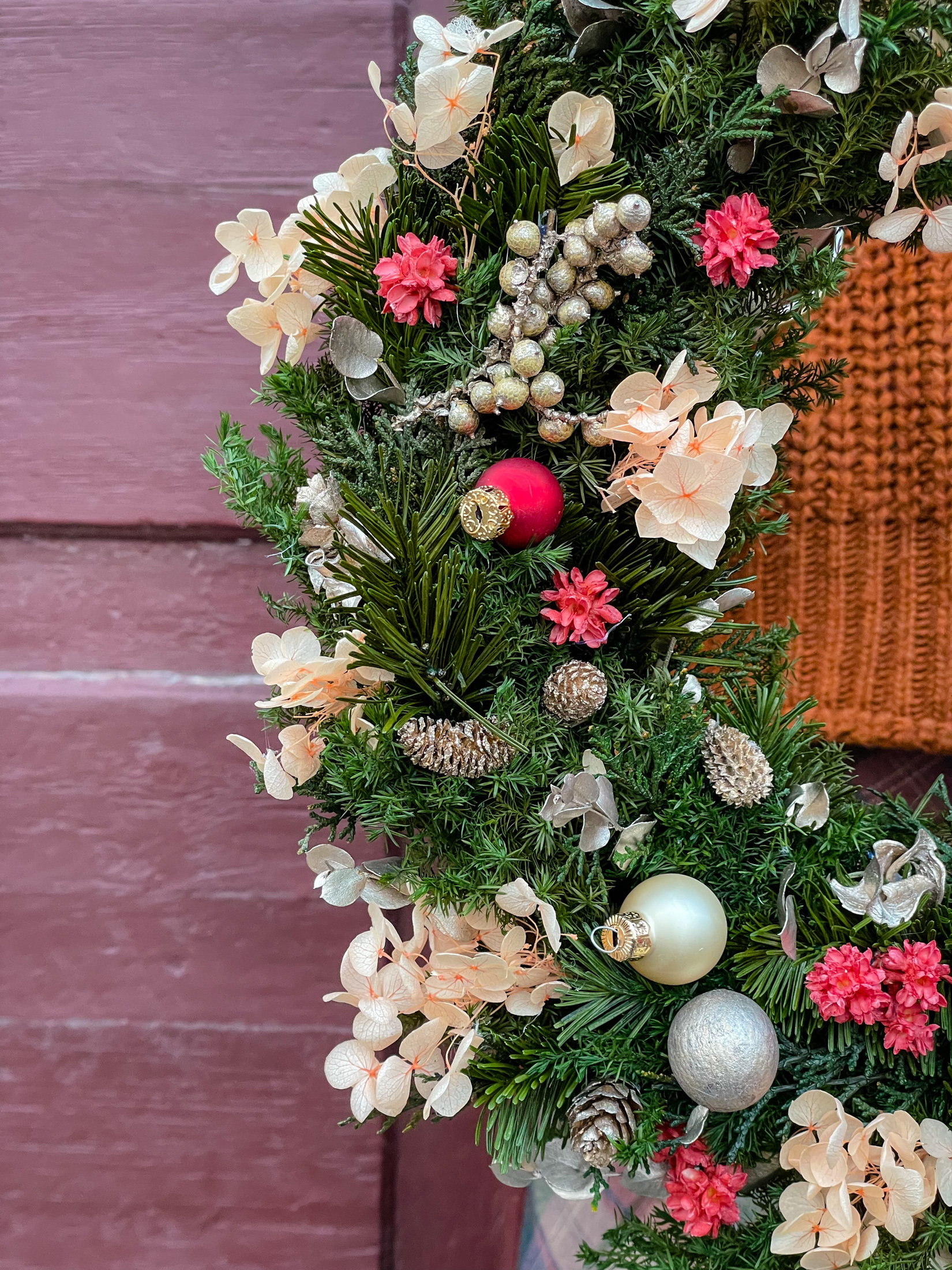 Jõulupärja tegemisel kasutasime uinuvat lõhnavat küpressi, hortensiat, craspediat, eukalüpti ja klaasist ehteid. Sobib kasutamiseks ainult sisetingimustes.