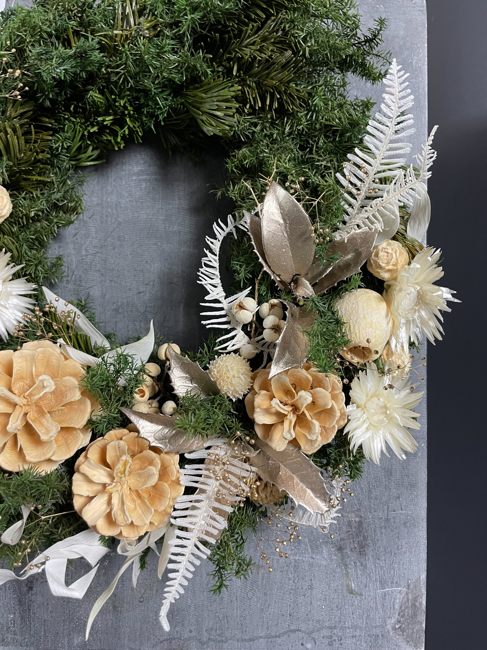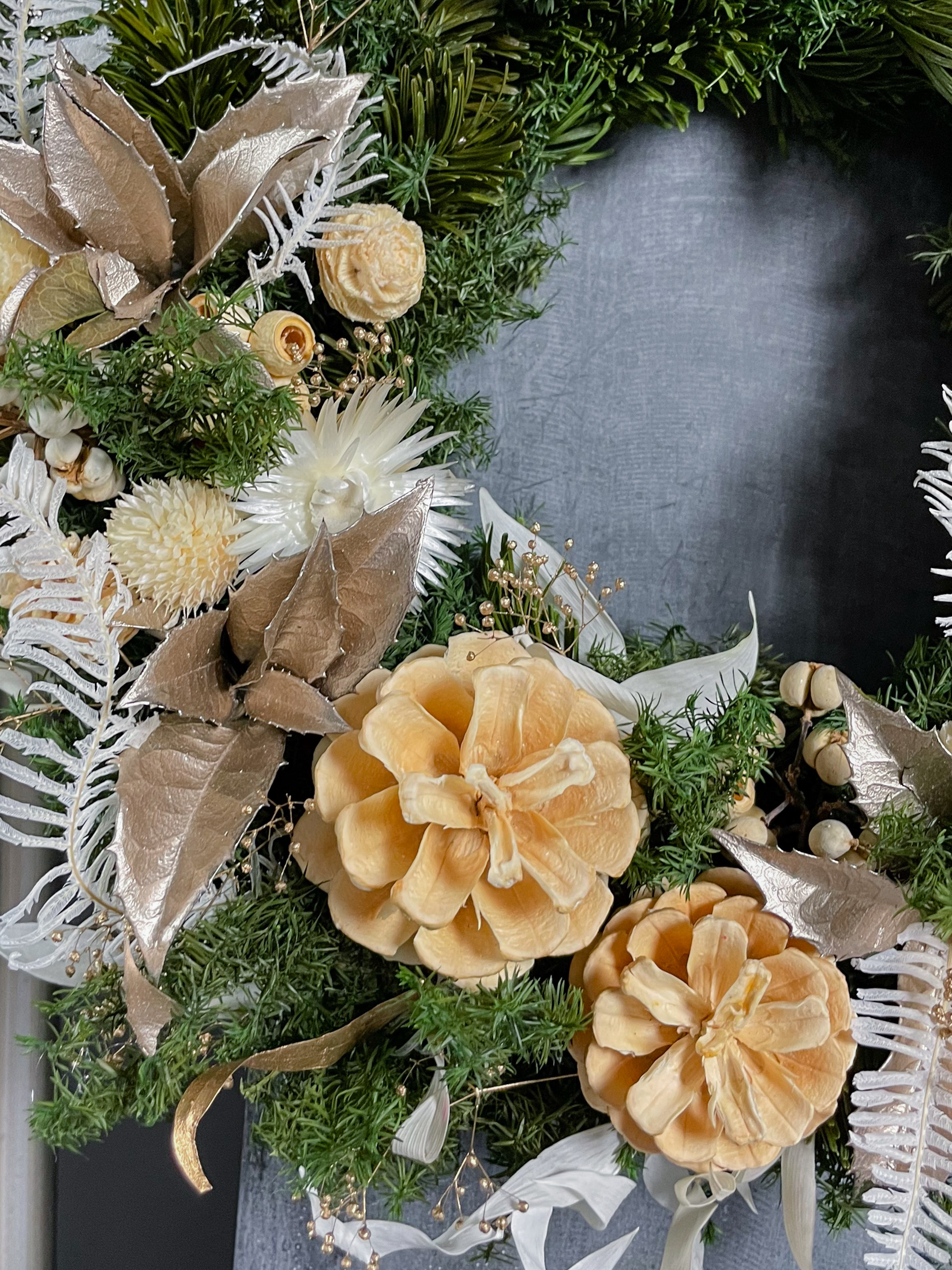 Jõulupärja tegemisel kasutasime uinuvat lõhnavat küpressi, pleegitud sõnajala lehti ja käbisi, eukalüpti, ilexi, kipslille ja palju muud. Sobib kasutamiseks ainult sisetingimustes.
