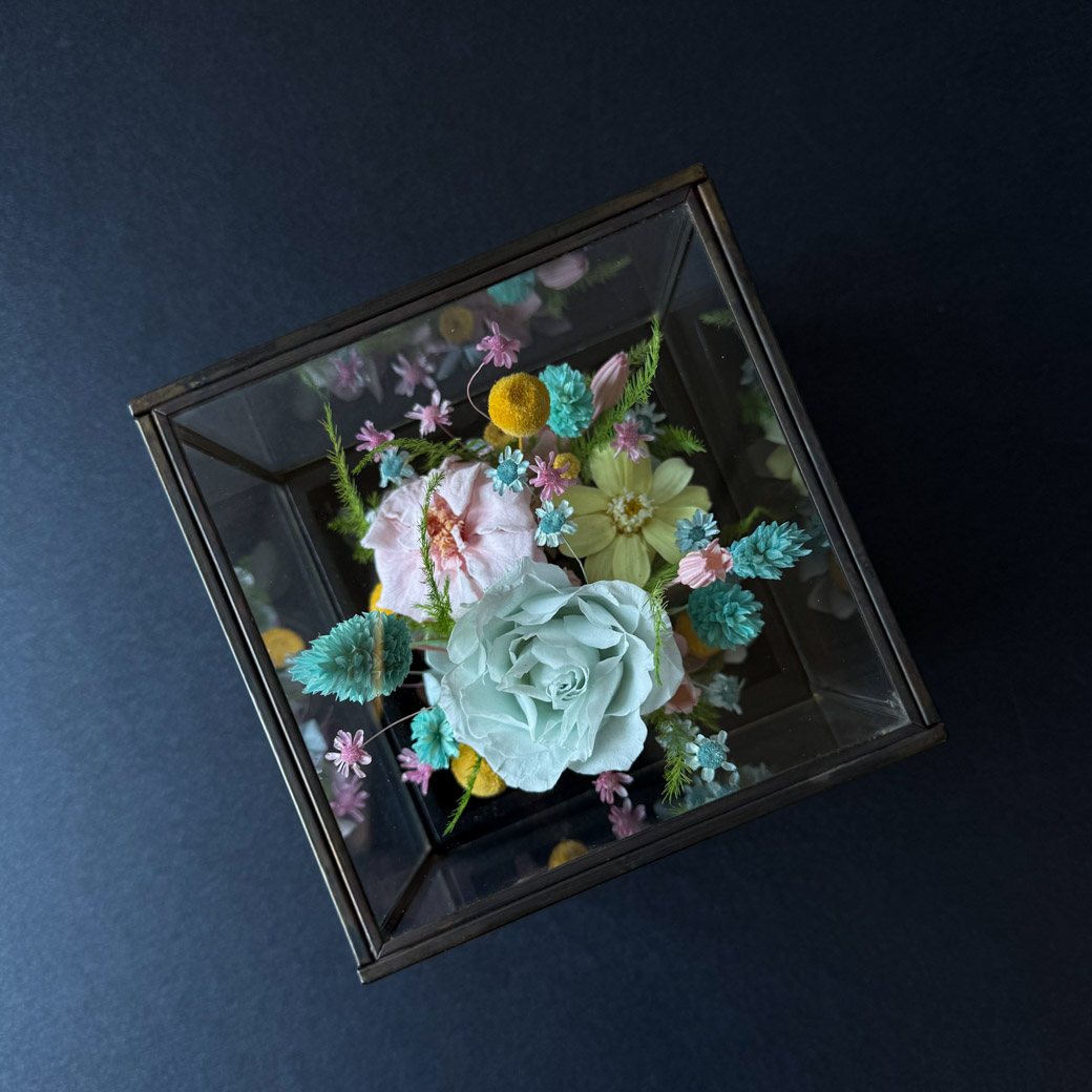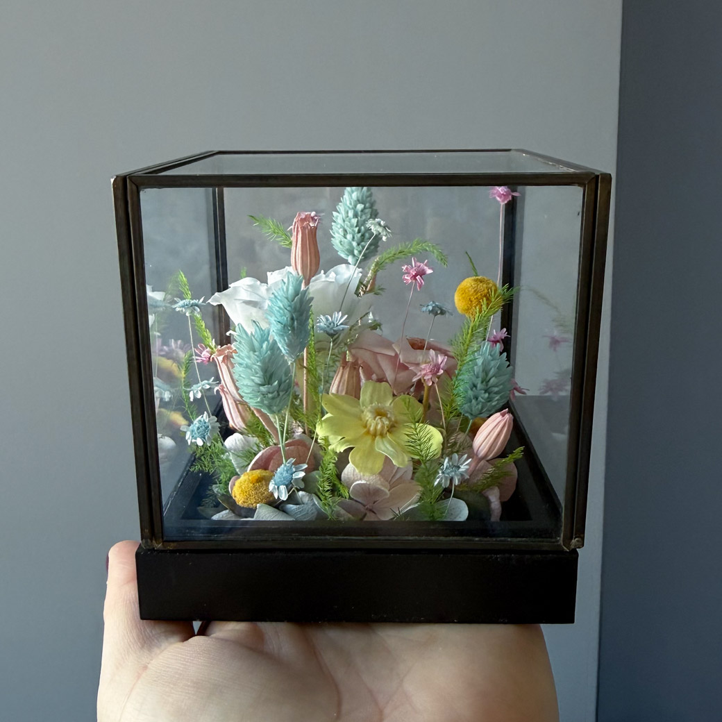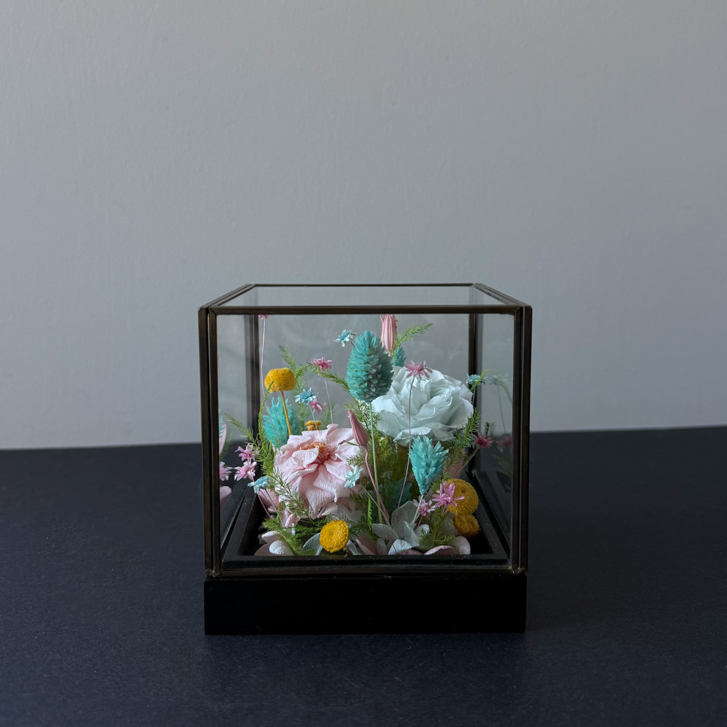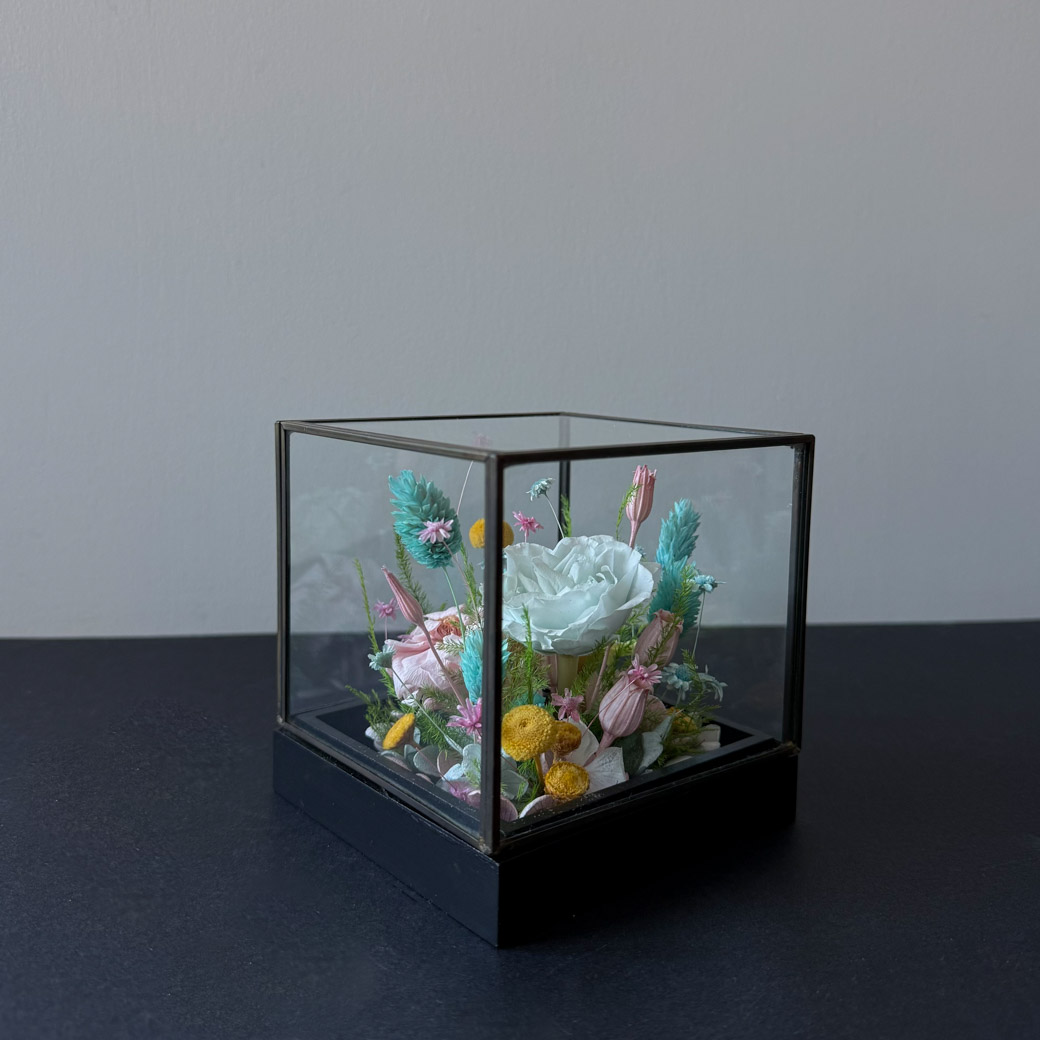 Luksuslik klaasist lillekarp naturaalsete uinuvate lilledega on unikaalne Eestis käsitsi valmistatud kunstiteos. Stabiliseeritud õied püsivad muutumatult kaunina aastaid! Suurepärane kingiidee eriliseks tähtpäevaks mis toob saajale rõõmu eriti pikka aega.