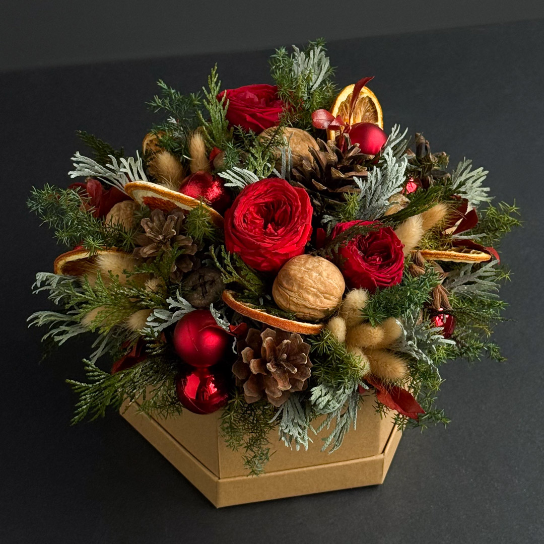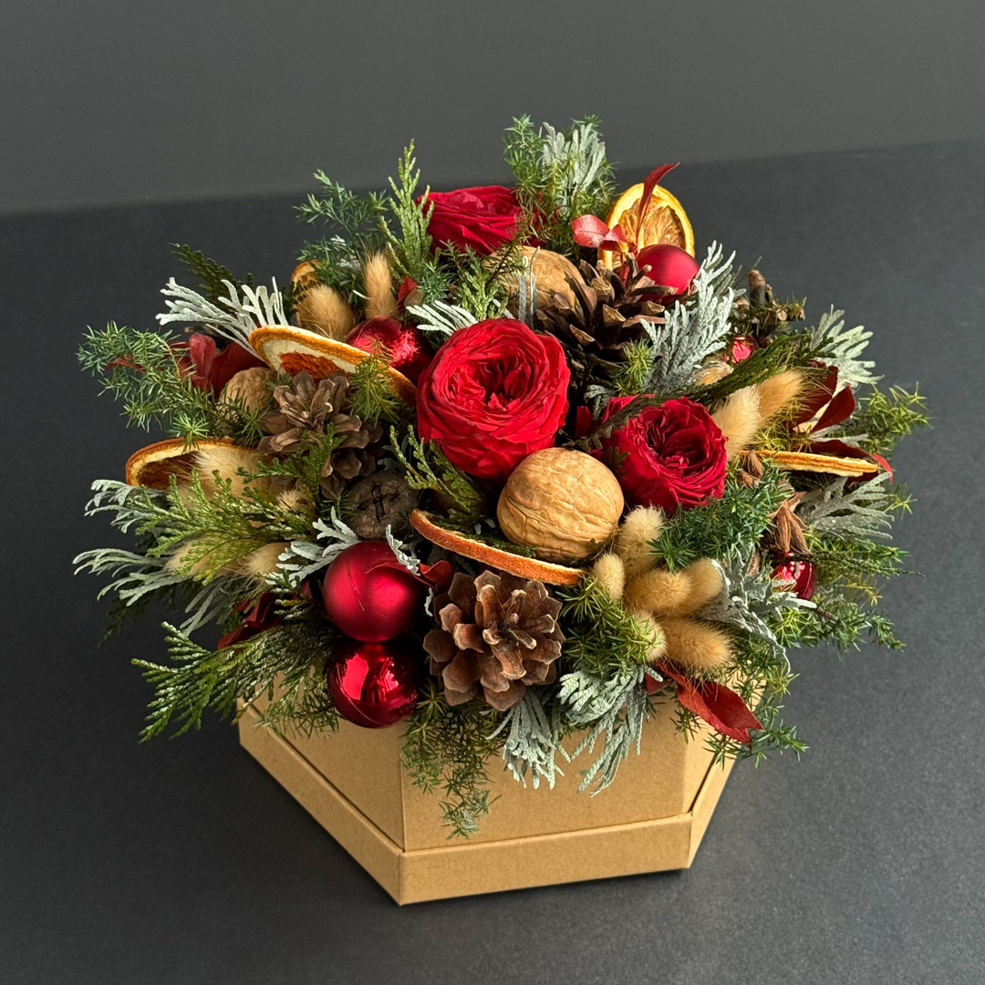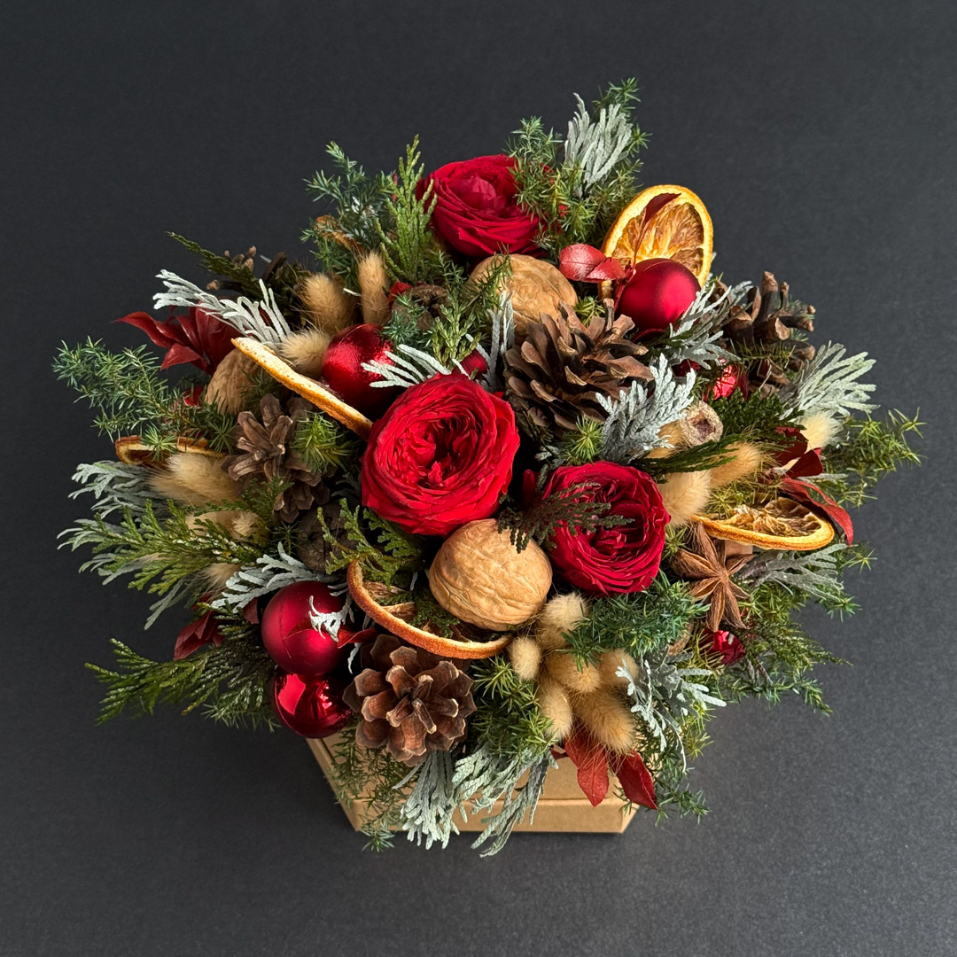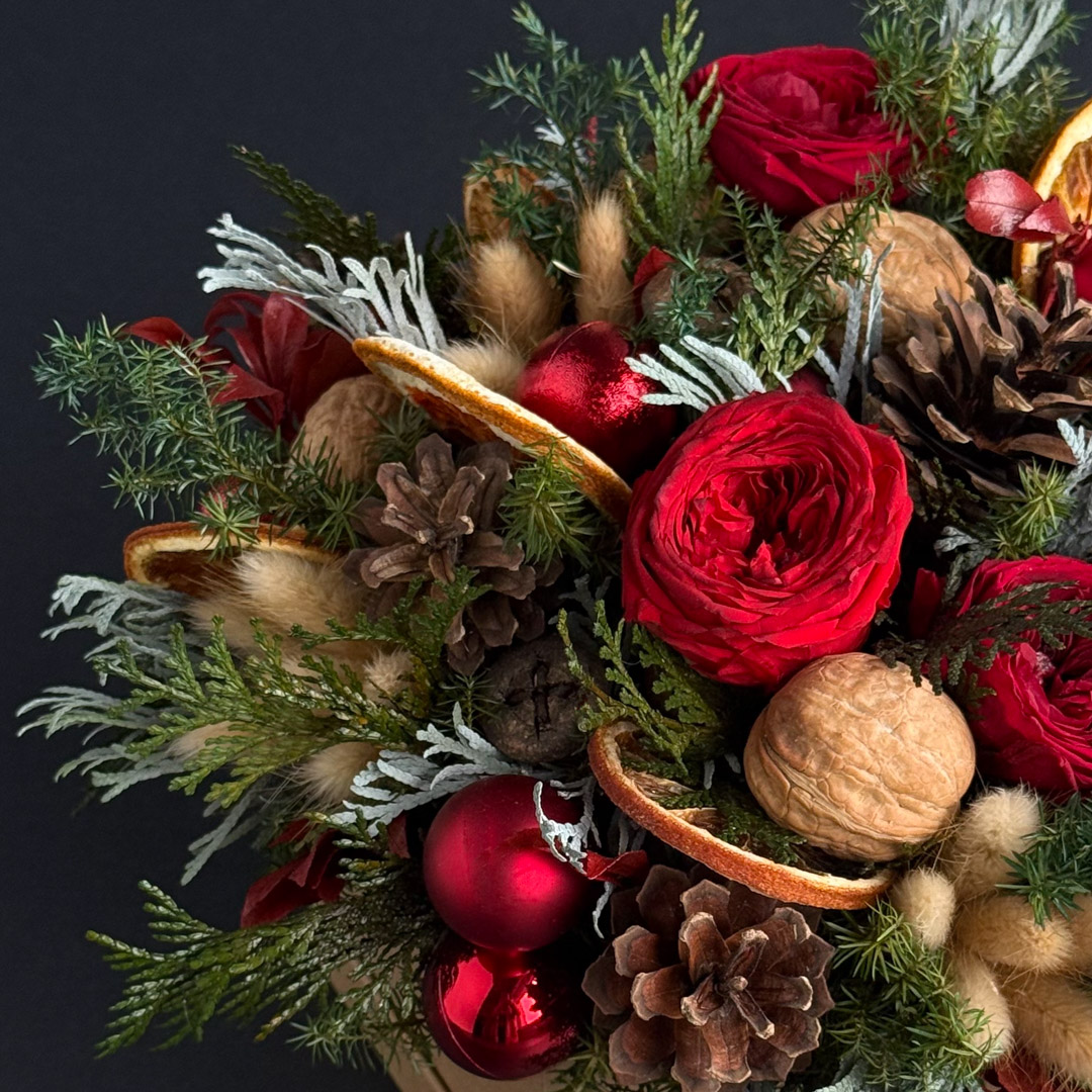 Lillekoostis: uinuv roos, hortensia, puuvill, pähklid, käbid, jõulukuulid, lõnav küpress, kuldne eukalüp ja palju muud