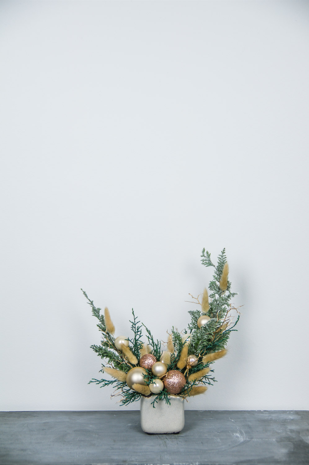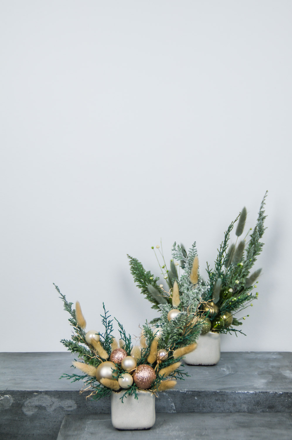 Stabiliseeritud taimedest ja küpressist väike lilleseade keraamilises potis pastelsete jõulukuulidega. Lilleseades on stabiliseeritud lõhnav küpress, lagurus ja muud taimed. Väike keraamiline pott kuulub komplekti.