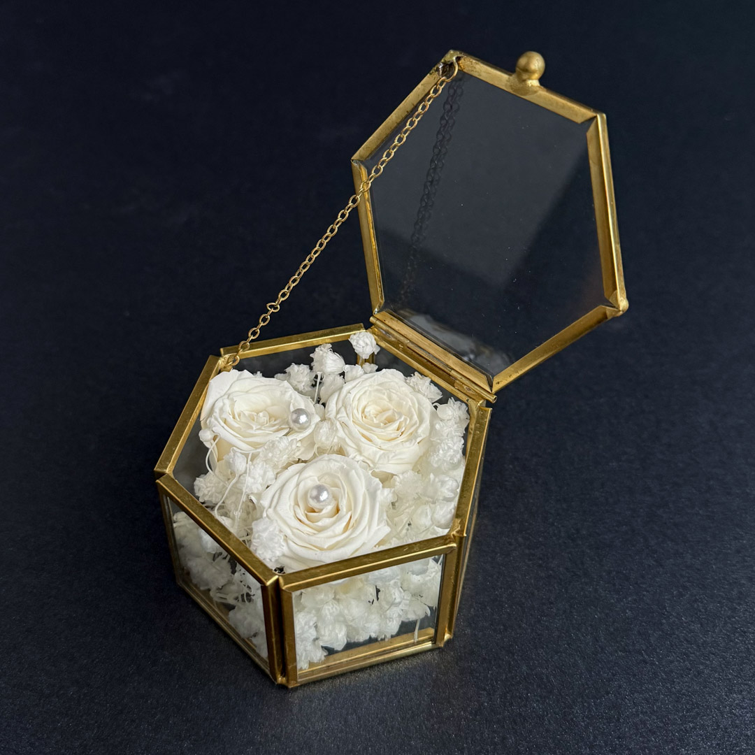 Luksuslik klaasist sõrmustekarp naturaalsete uinuvate lilledega on unikaalne Eestis käsitsi valmistatud kunstiteos. Stabiliseeritud õied püsivad muutumatult kaunina aastaid! Suurepärane aksessuaar eriliseks tähtpäevaks mis jääb eriti kena pulmapäeva ilupiltidel.